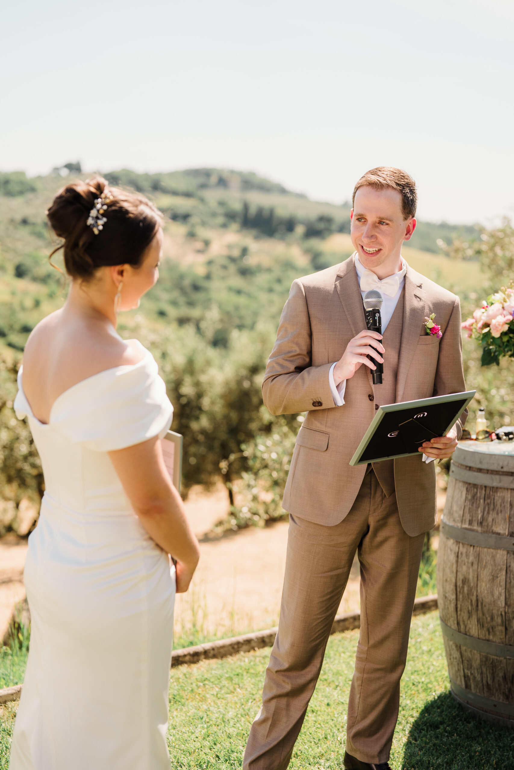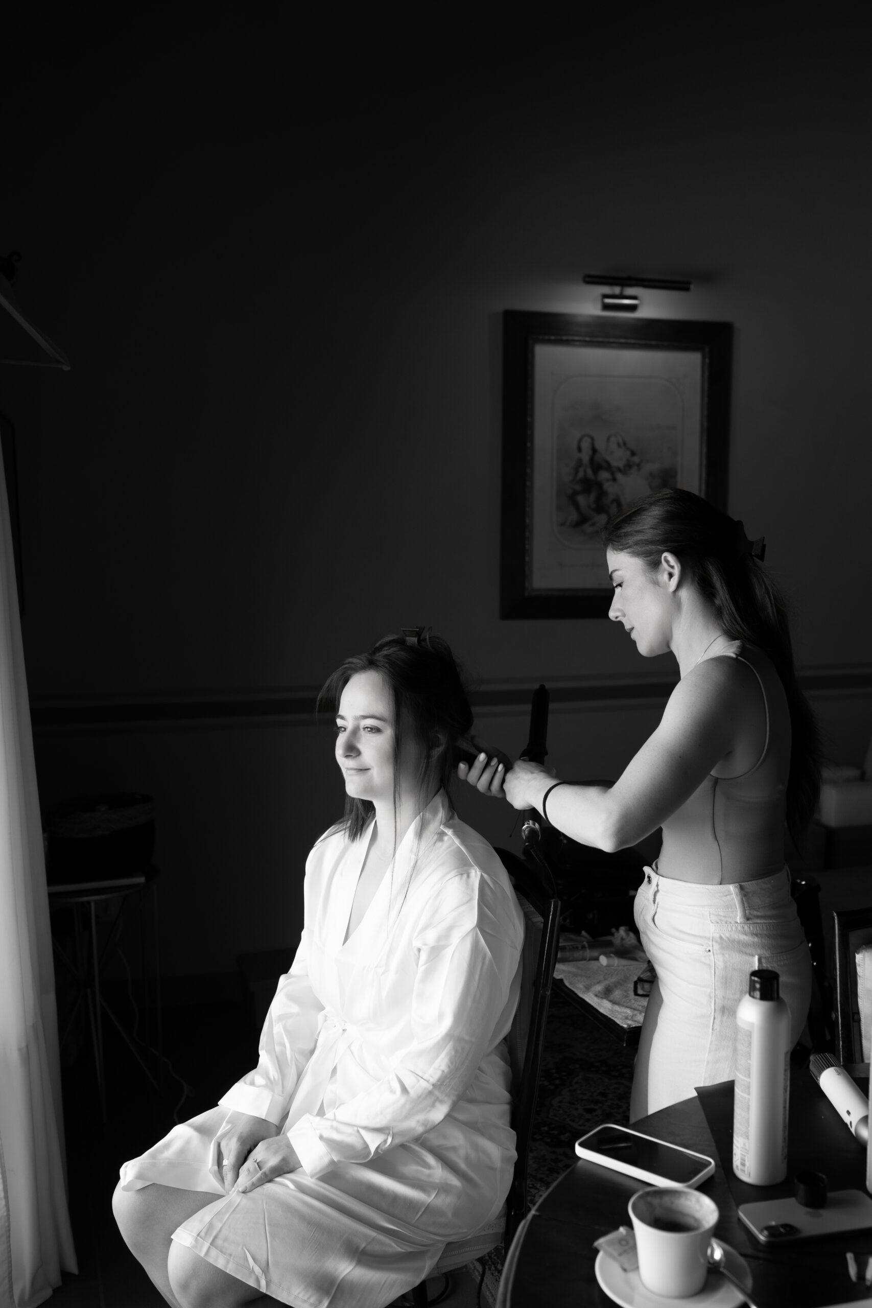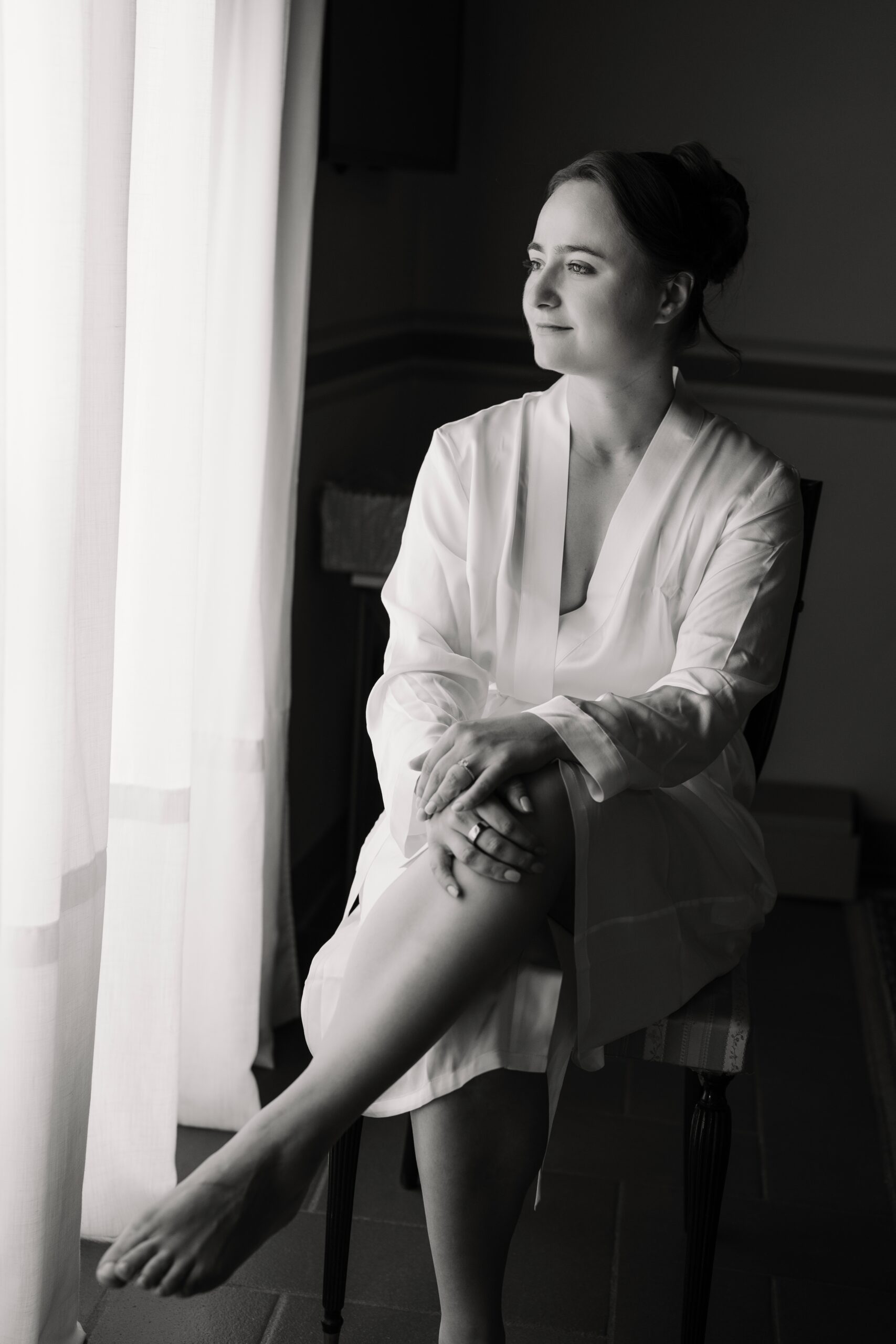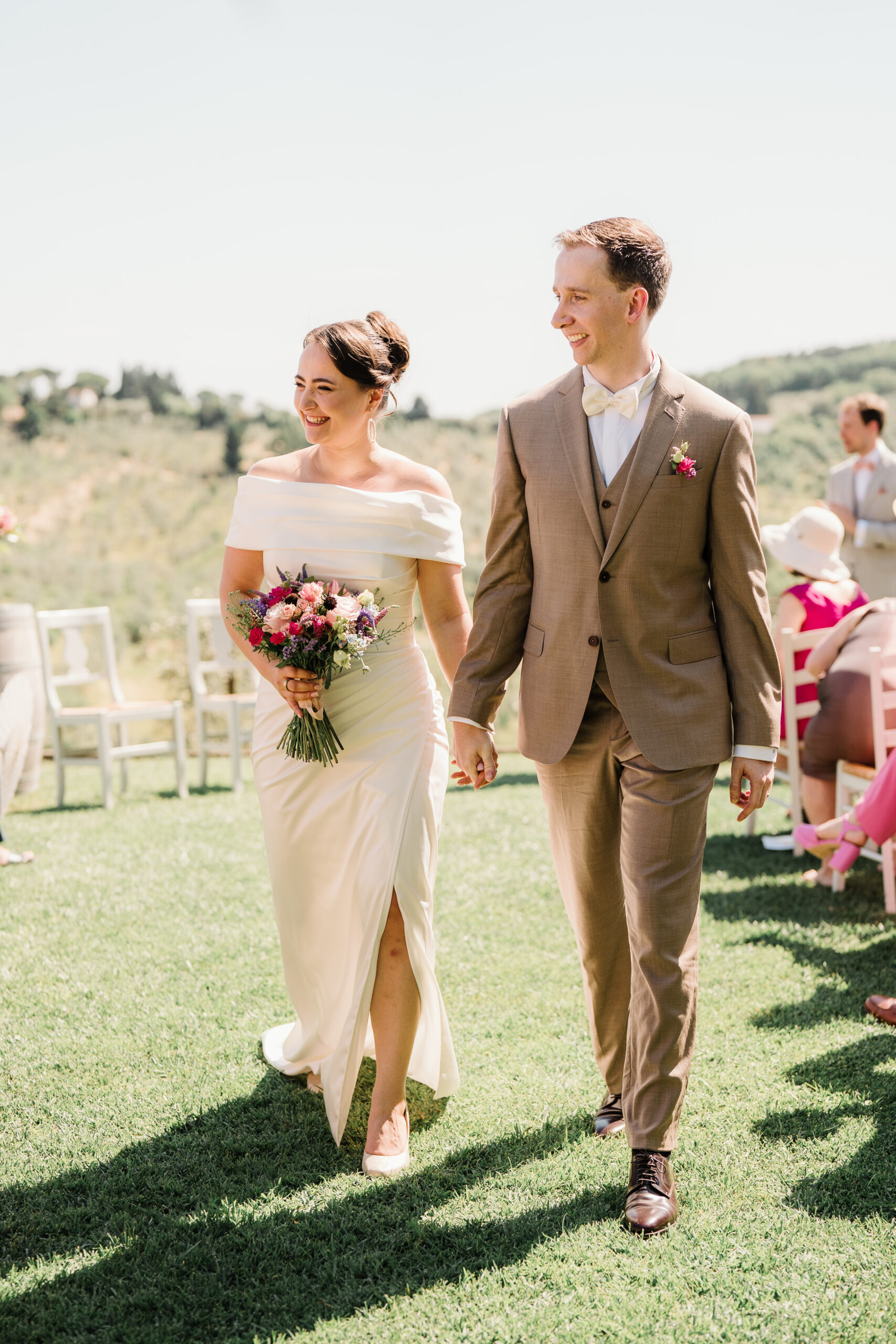 The preparations took place inside the villa, where soft window light created elegant and intimate portraits. The outdoor ceremony, set against the Tuscan countryside, was authentic and full of emotion as Valeria walked towards Johannes.