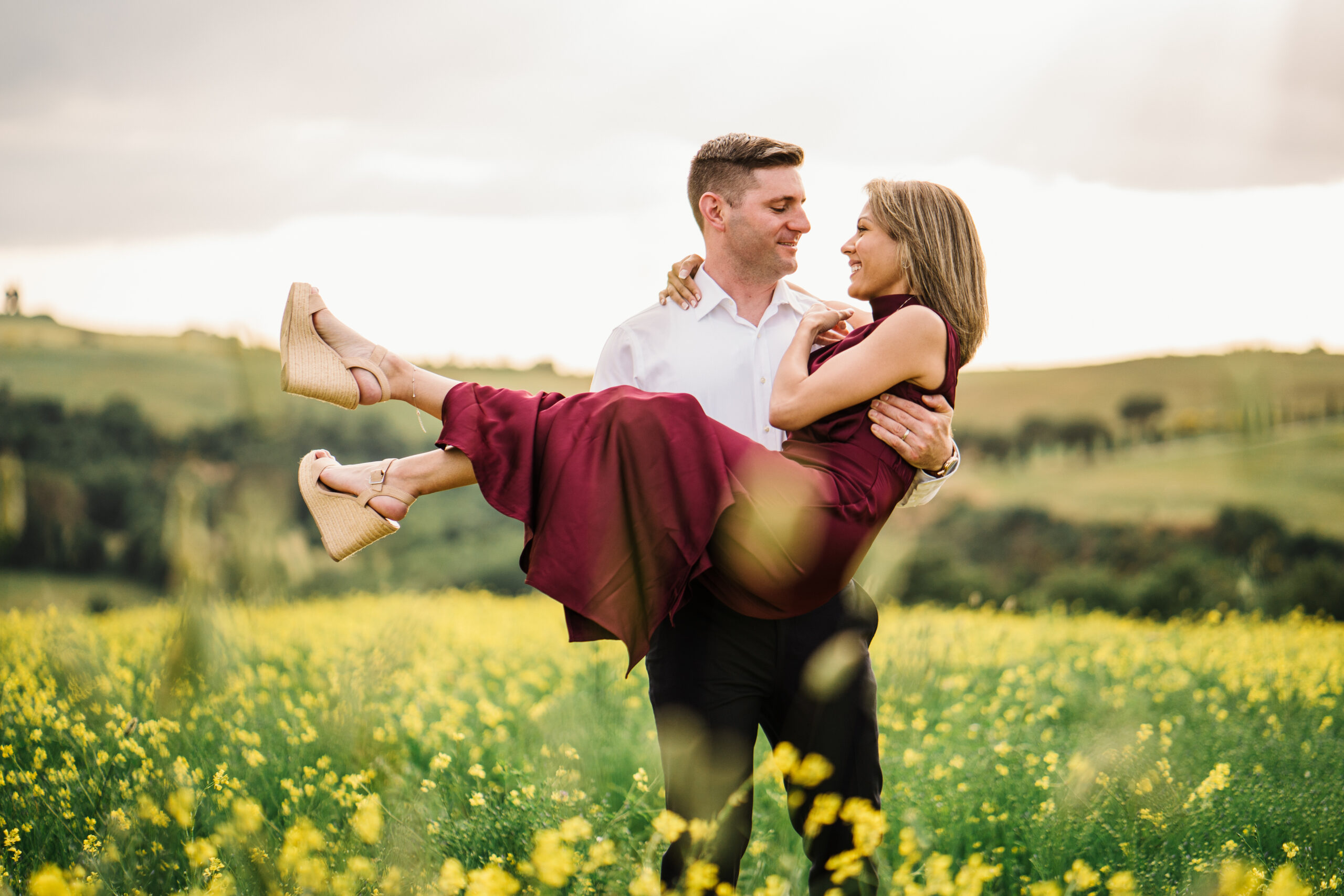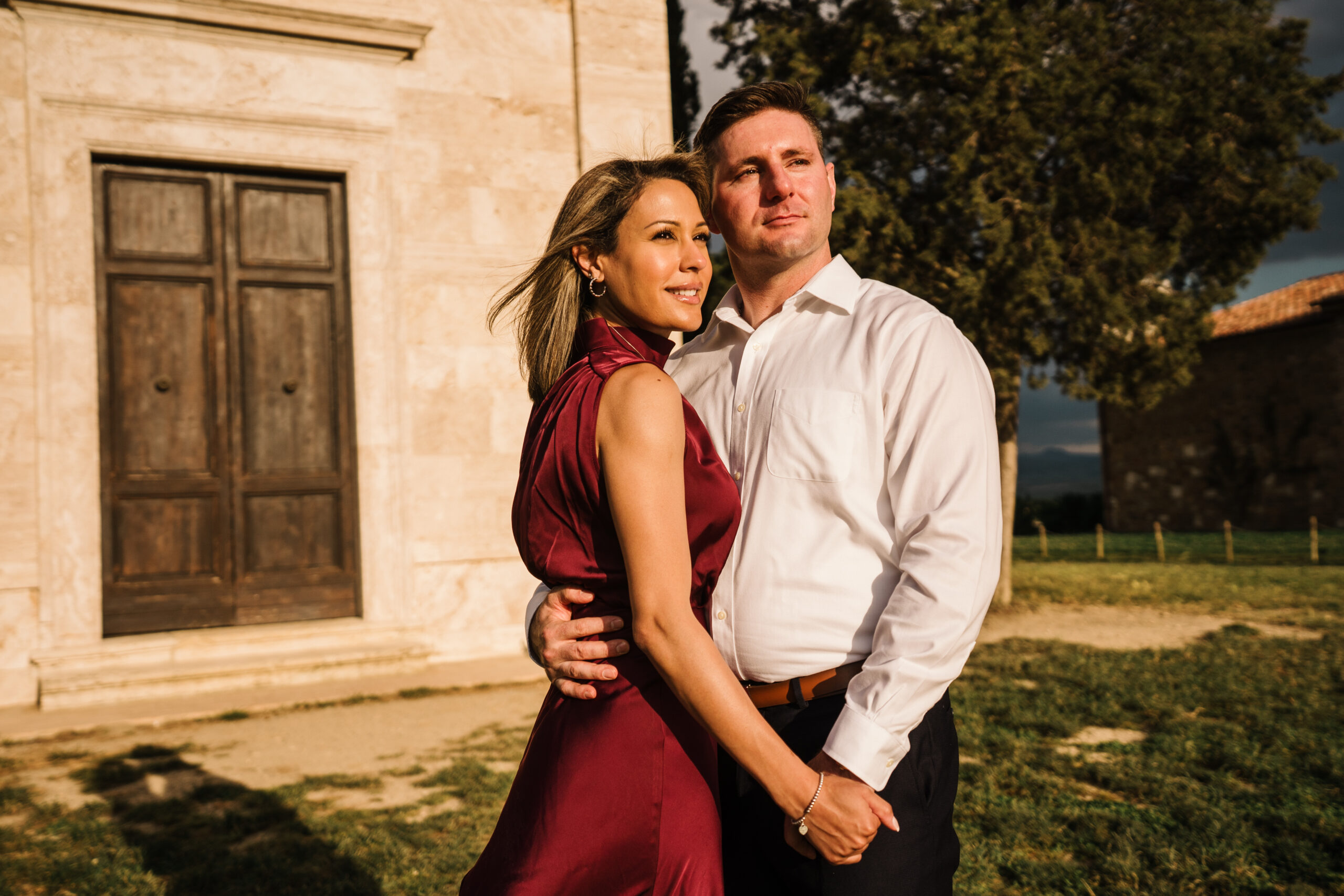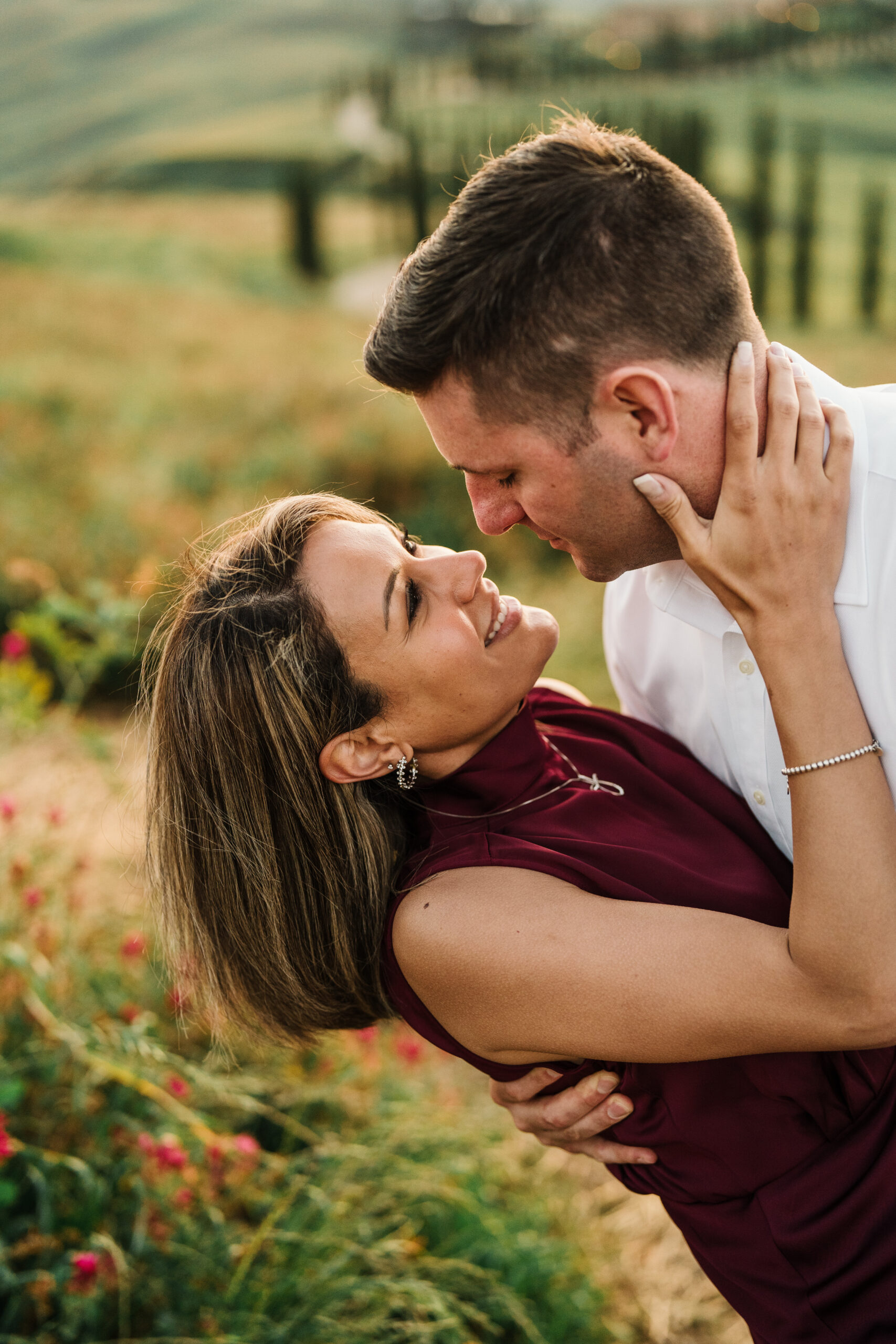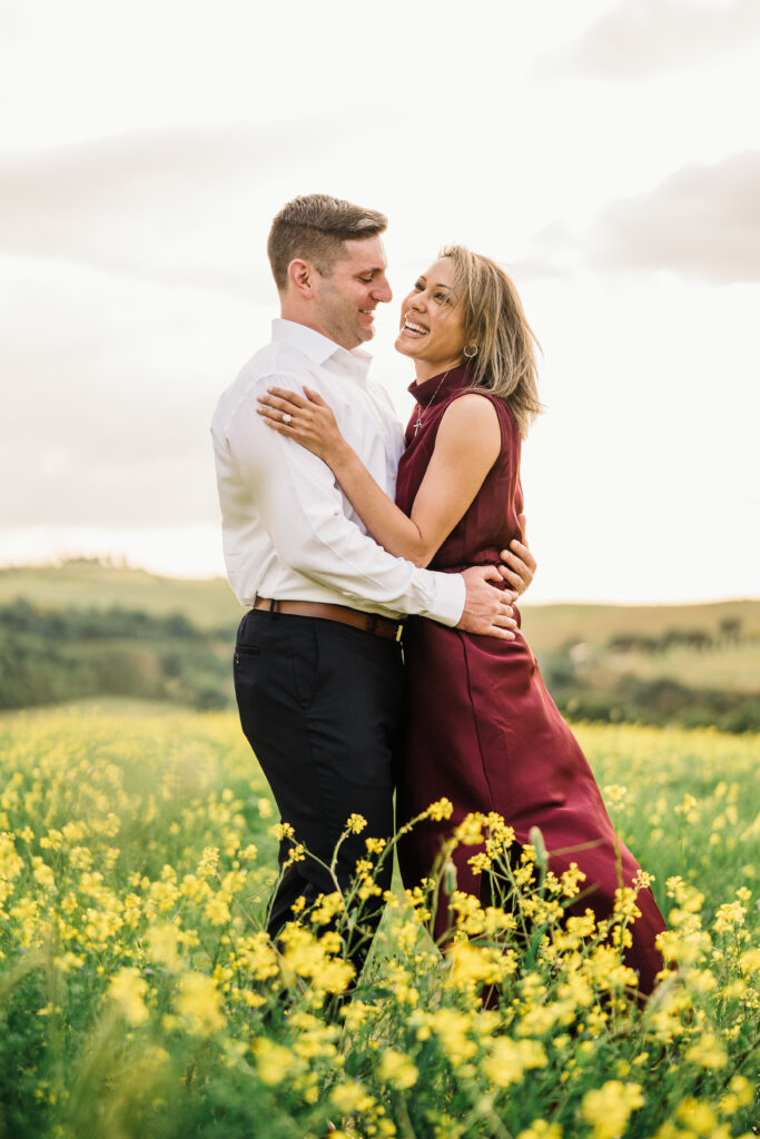 We started in the soft afternoon light, when the Tuscan landscape glows in golden tones. Surrounded by vineyards and open fields, Valeria and Kevin shared quiet, joyful moments together. Their laughter, gentle gestures, and natural chemistry turned the session into a true celebration of love.