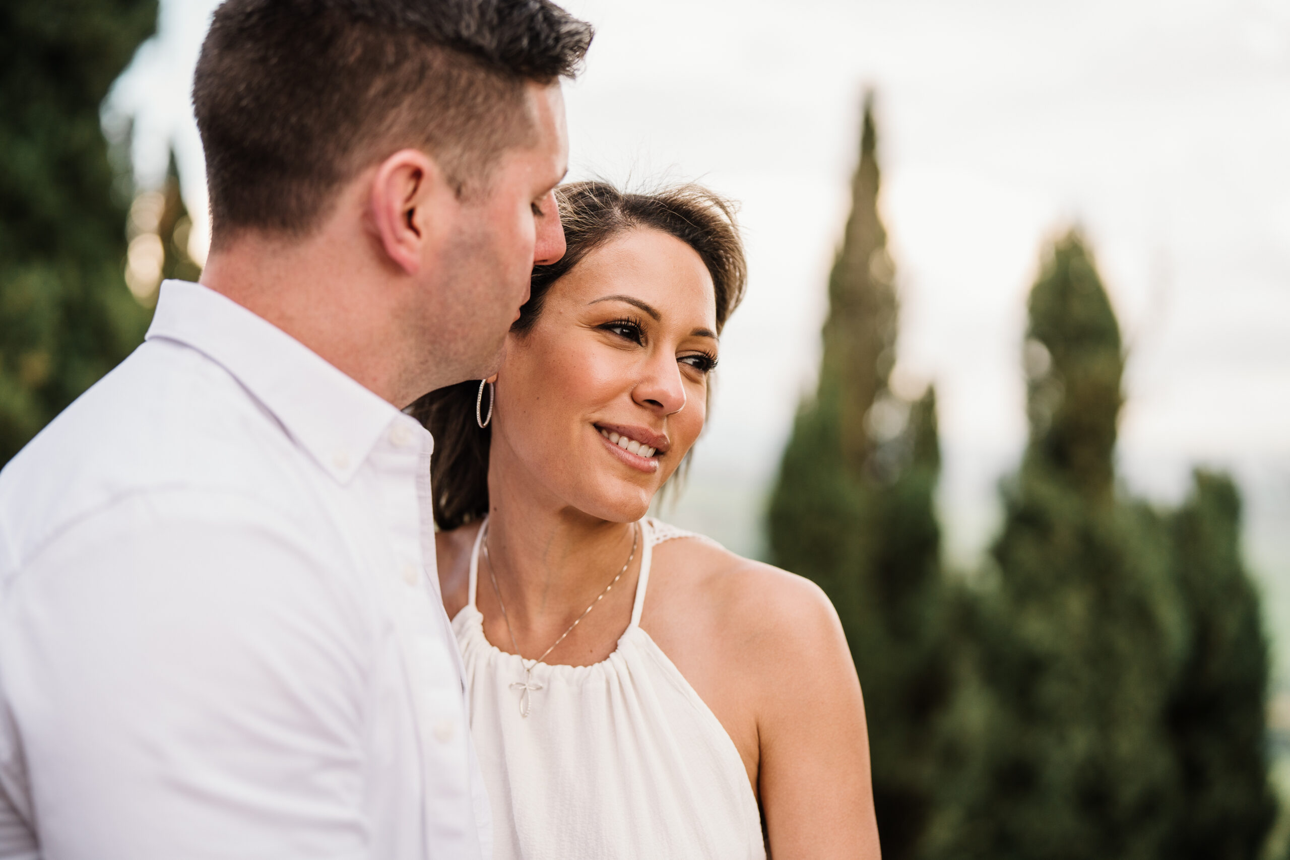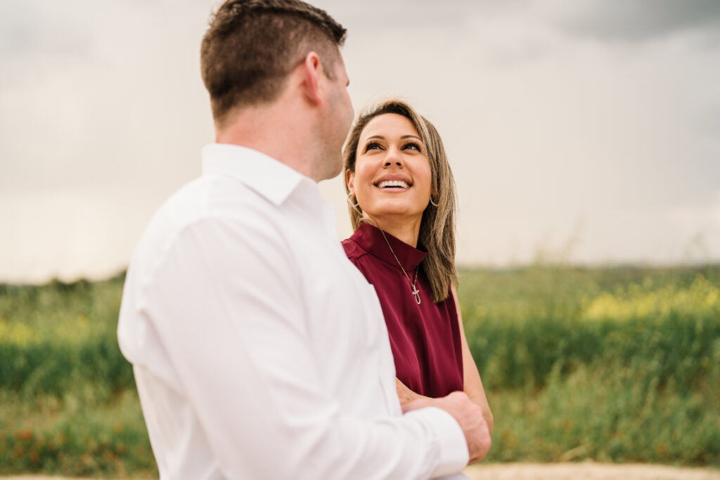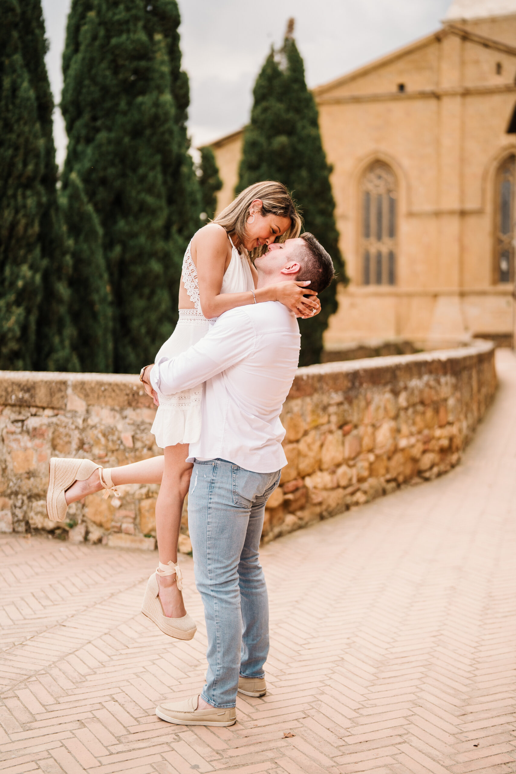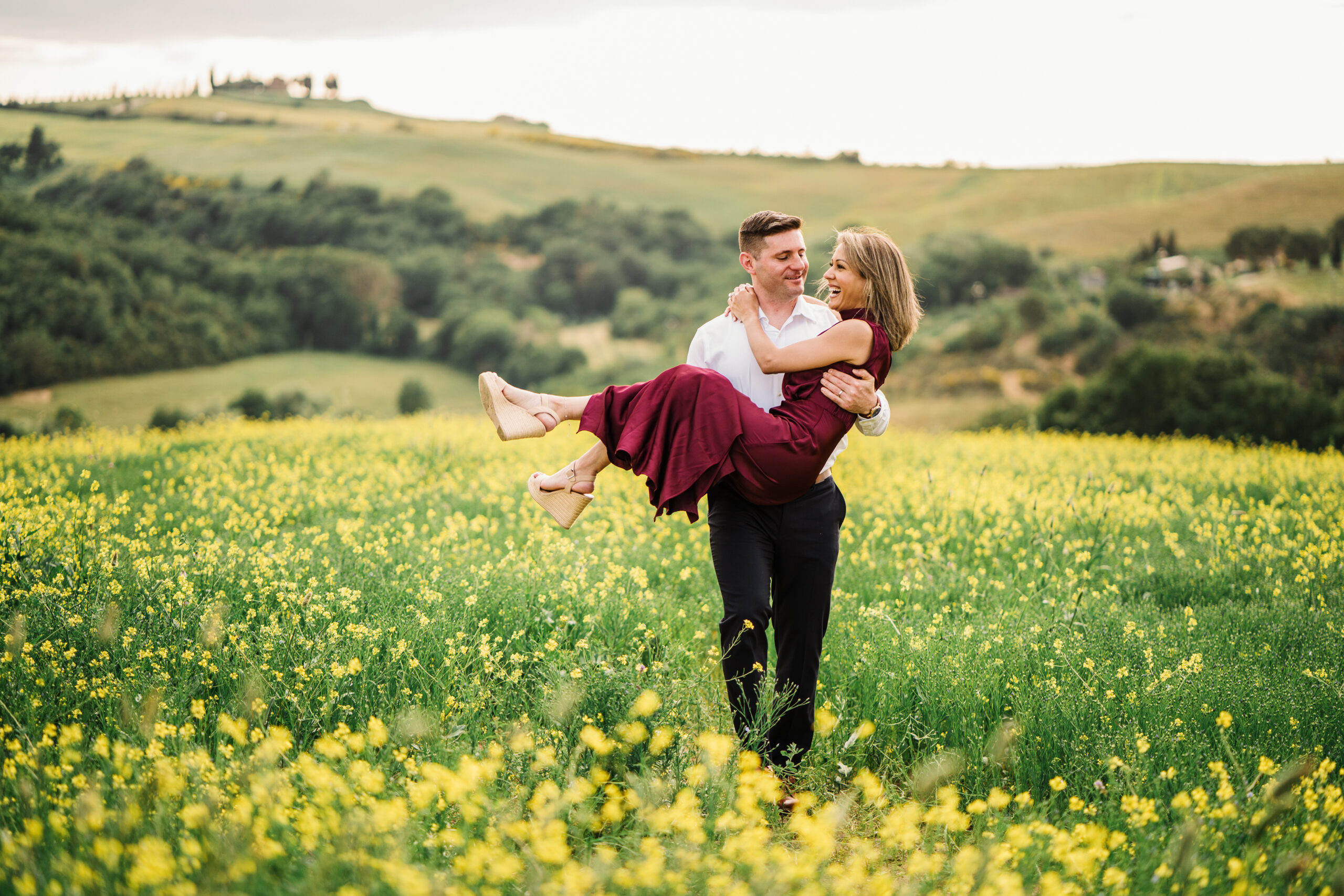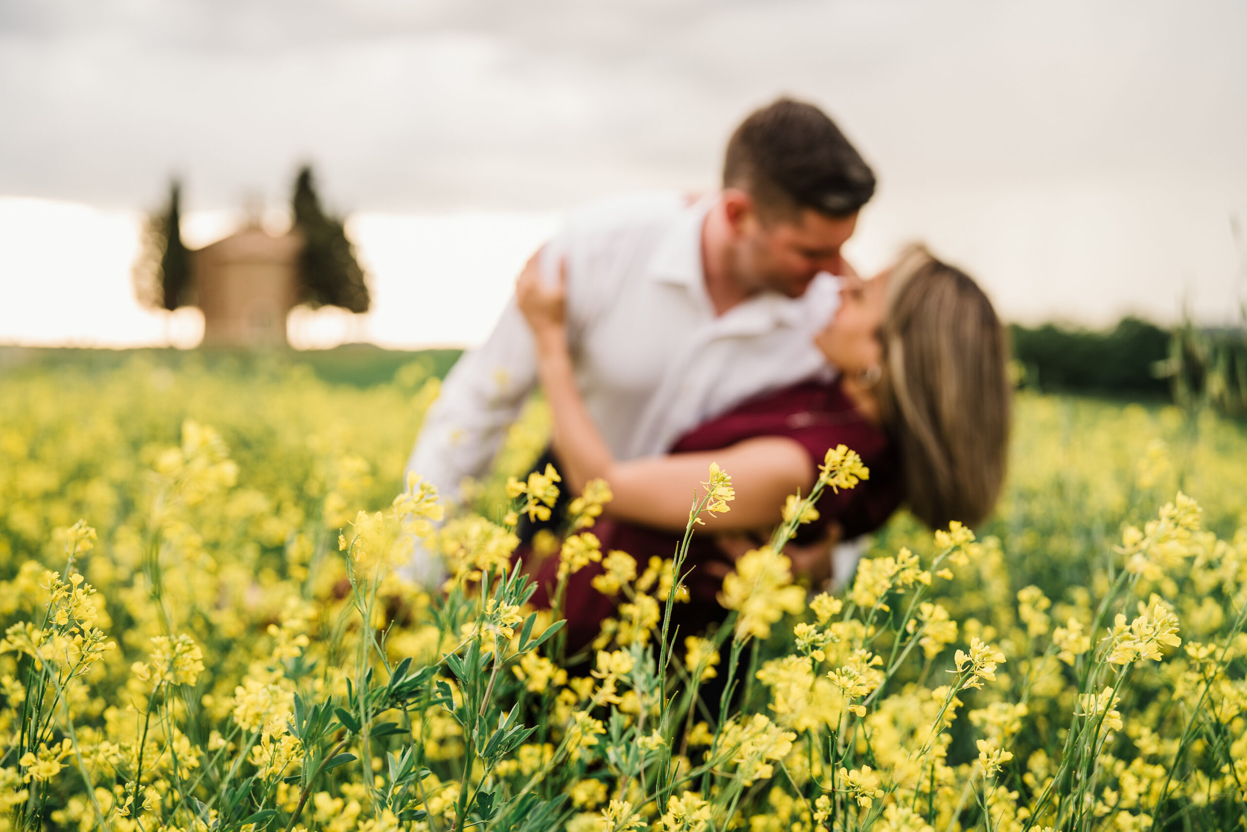 We started in the soft afternoon light, when the Tuscan landscape glows in golden tones. Surrounded by vineyards and open fields, Valeria and Kevin shared quiet, joyful moments together. Their laughter, gentle gestures, and natural chemistry turned the session into a true celebration of love.