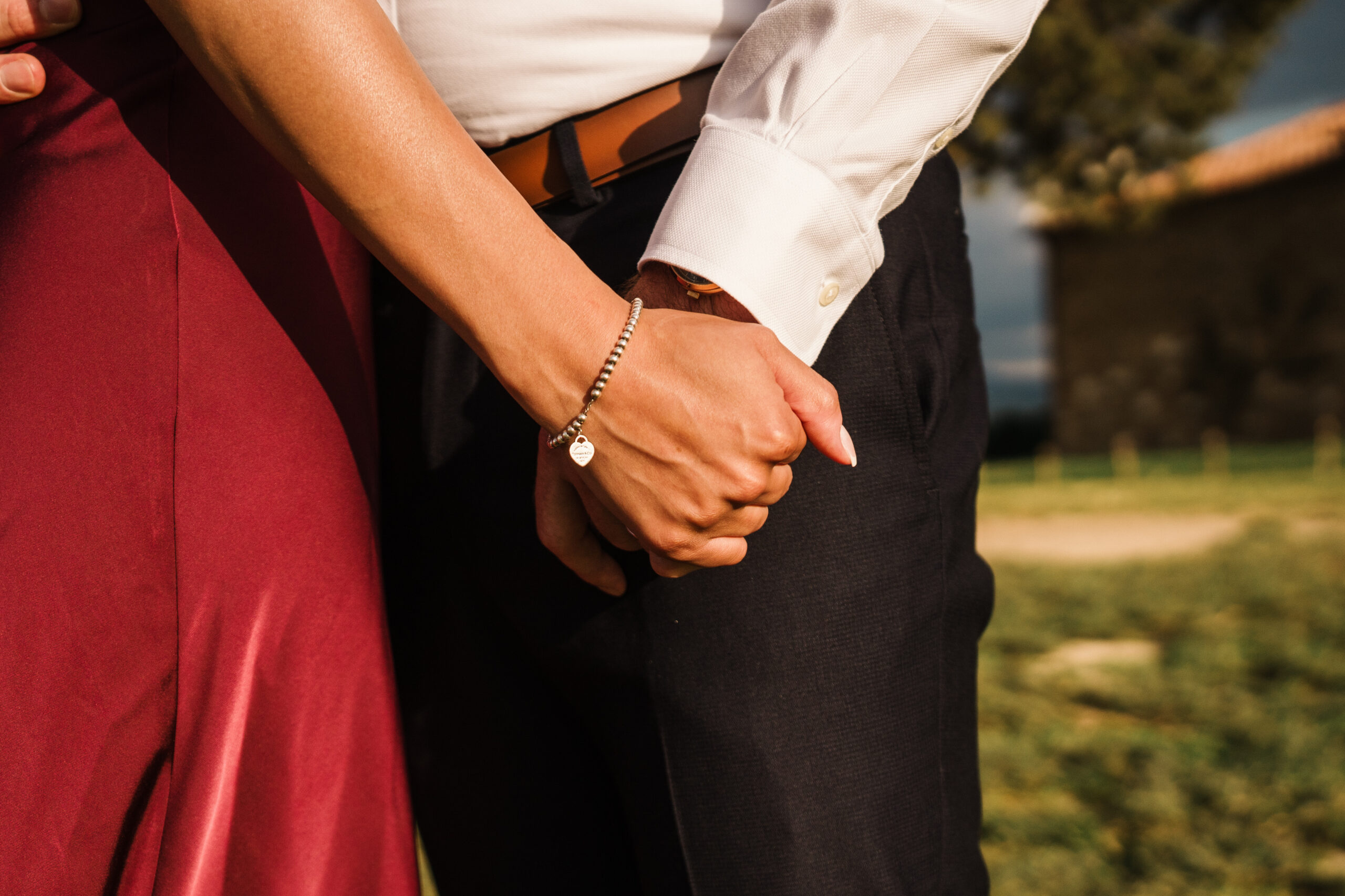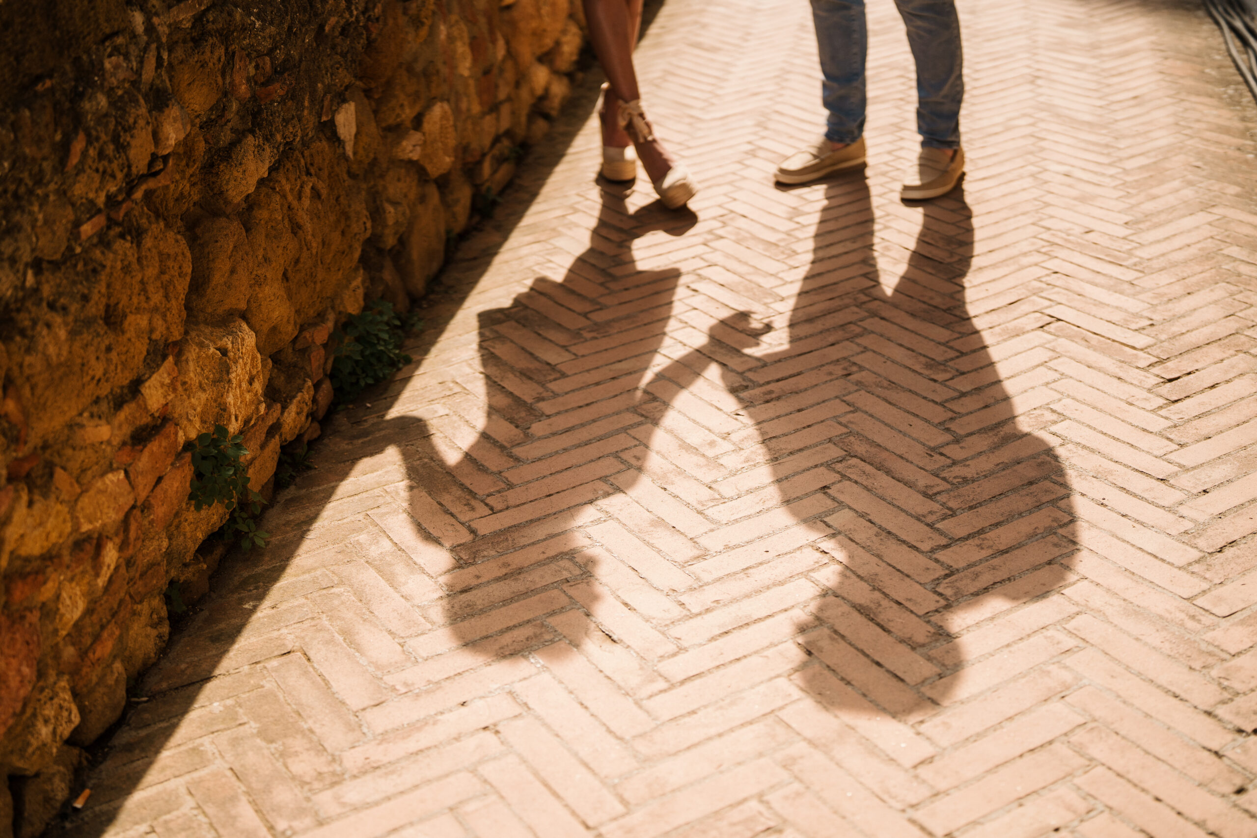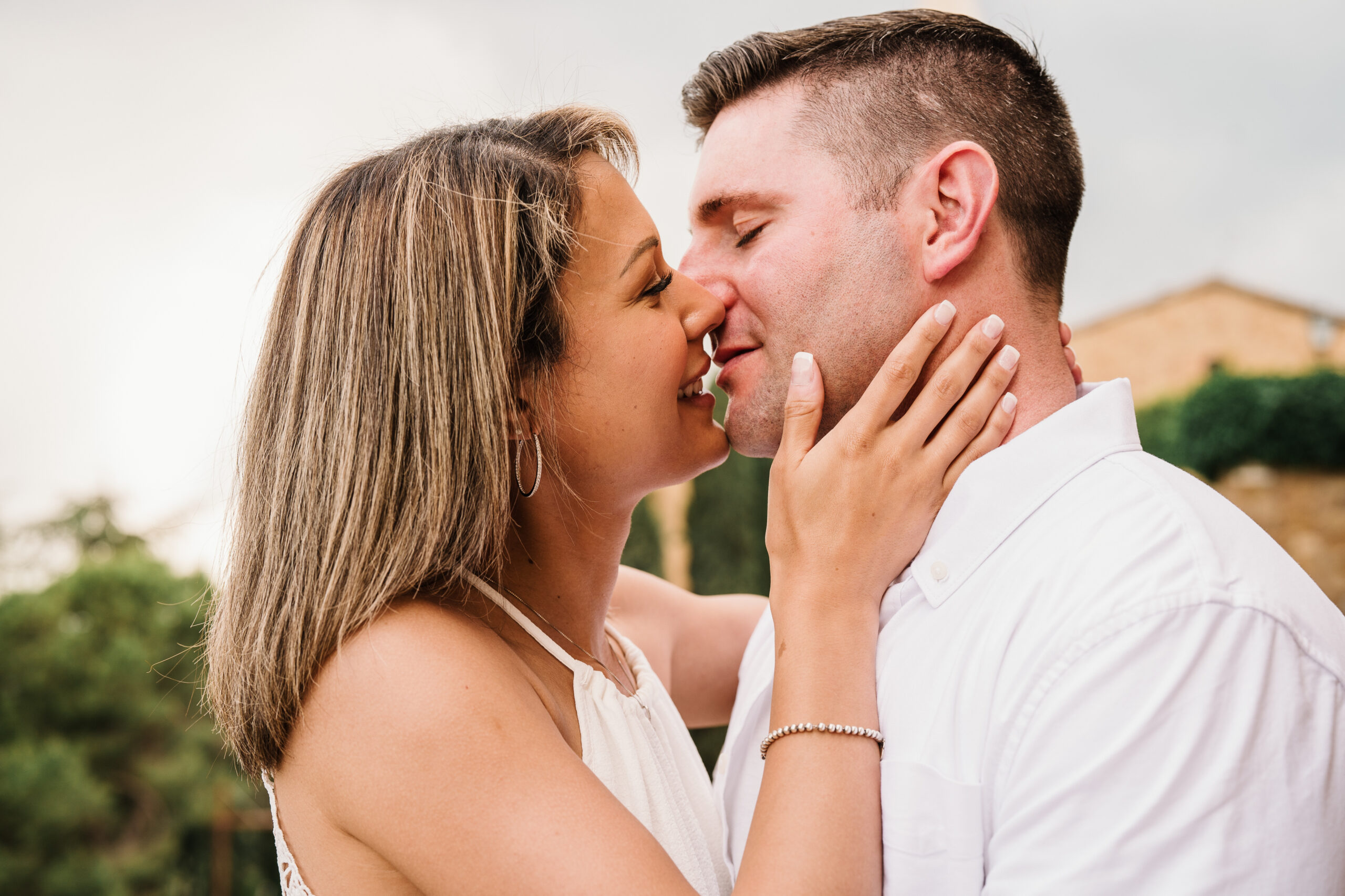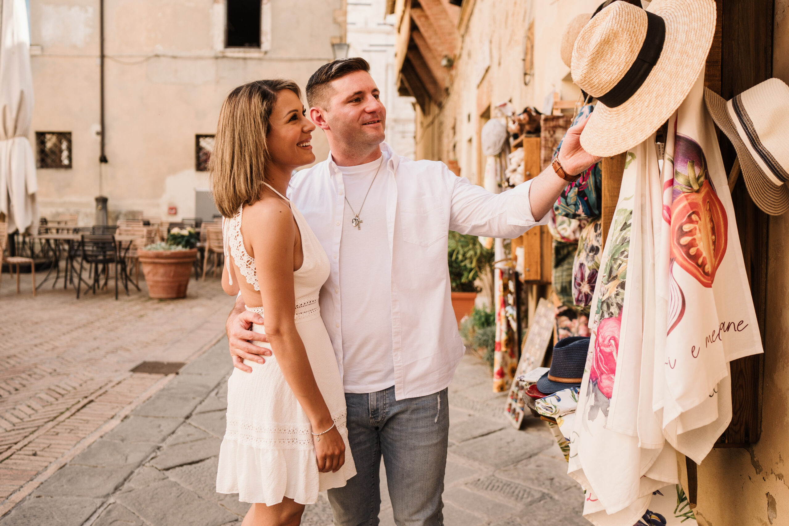 We started in the soft afternoon light, when the Tuscan landscape glows in golden tones. Surrounded by vineyards and open fields, Valeria and Kevin shared quiet, joyful moments together. Their laughter, gentle gestures, and natural chemistry turned the session into a true celebration of love.
