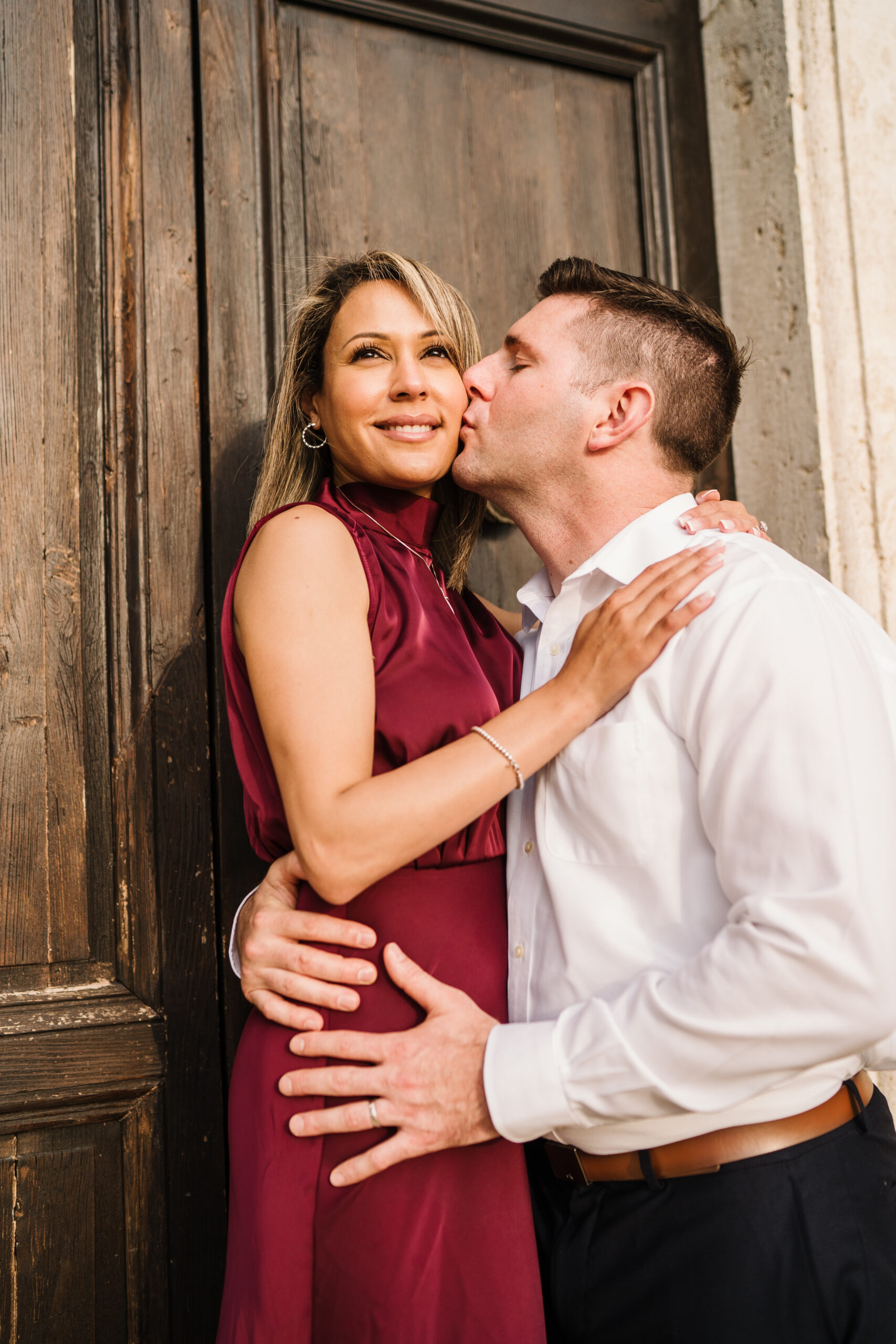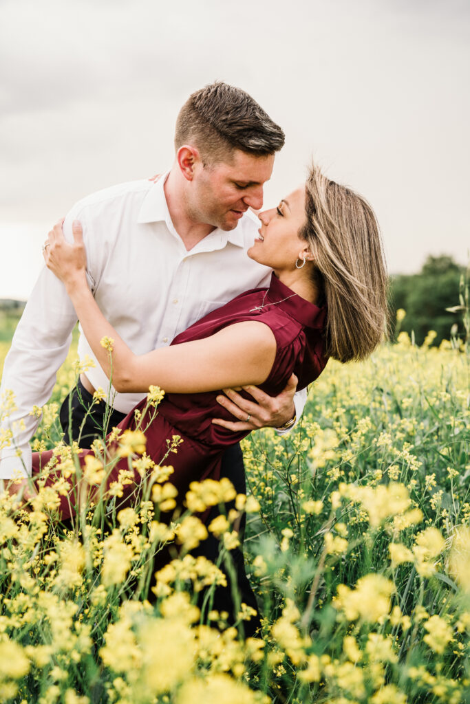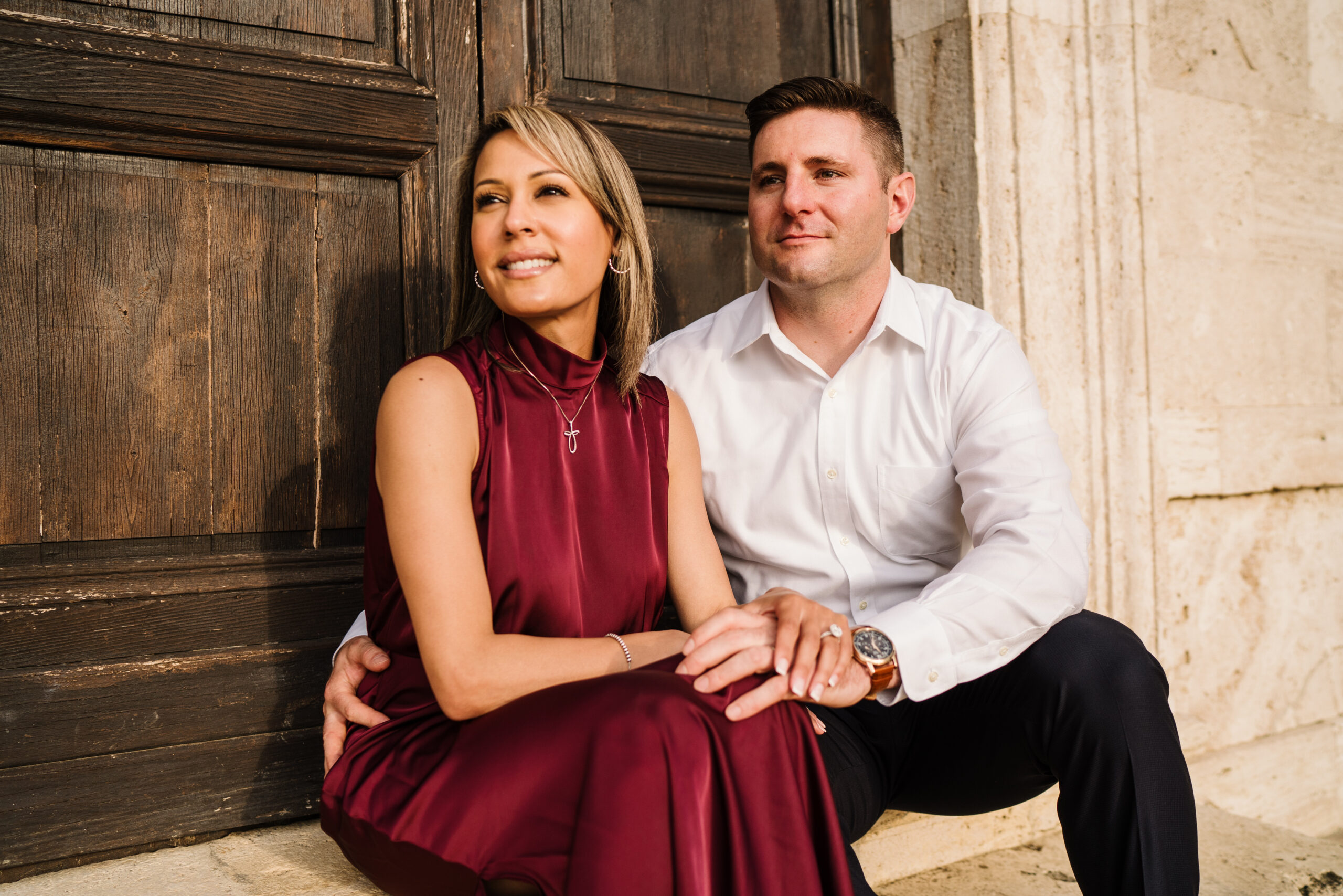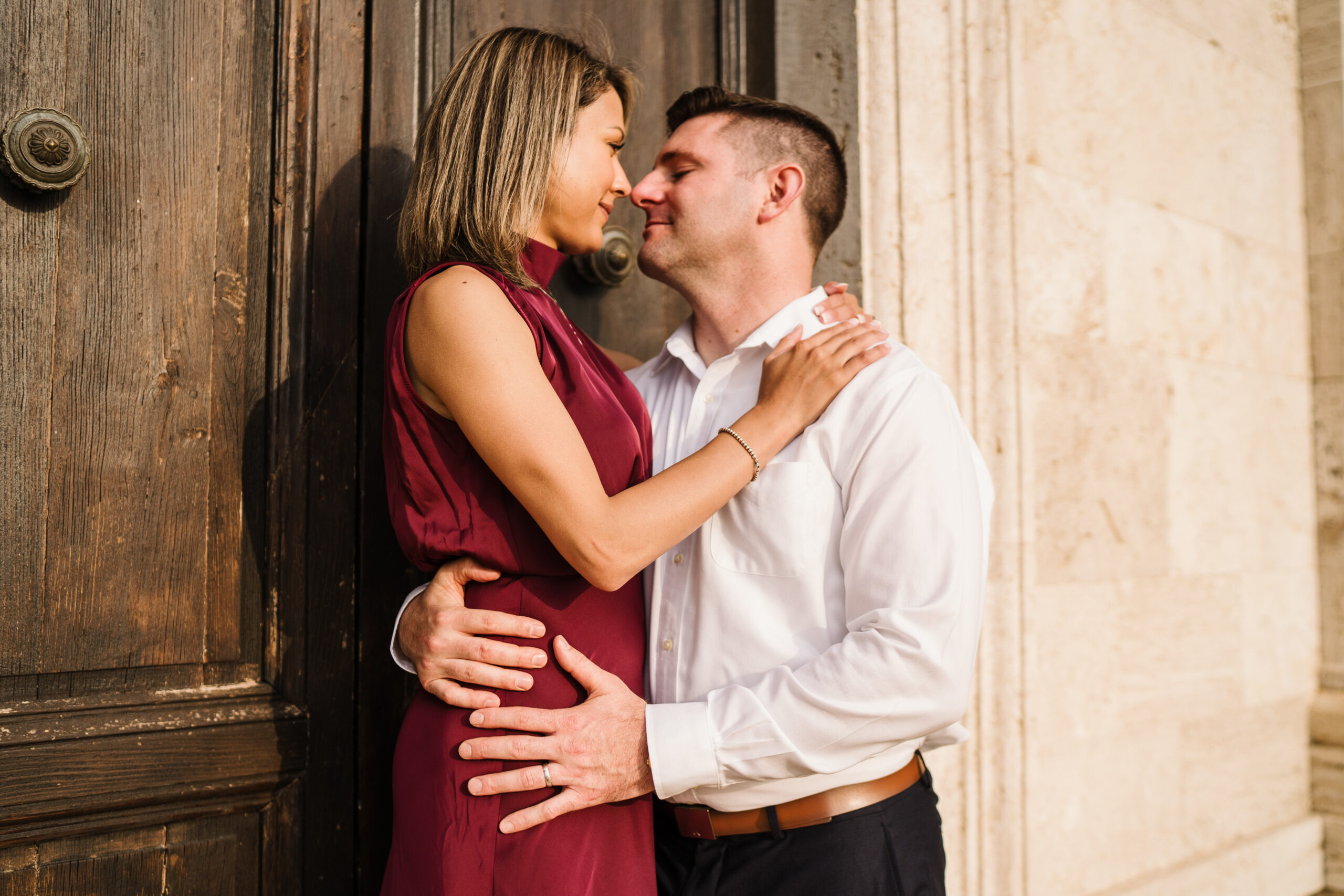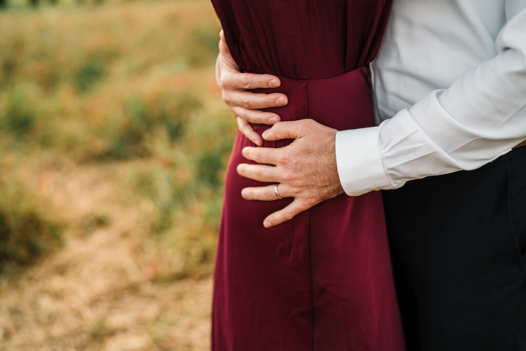 We started in the soft afternoon light, when the Tuscan landscape glows in golden tones. Surrounded by vineyards and open fields, Valeria and Kevin shared quiet, joyful moments together. Their laughter, gentle gestures, and natural chemistry turned the session into a true celebration of love.